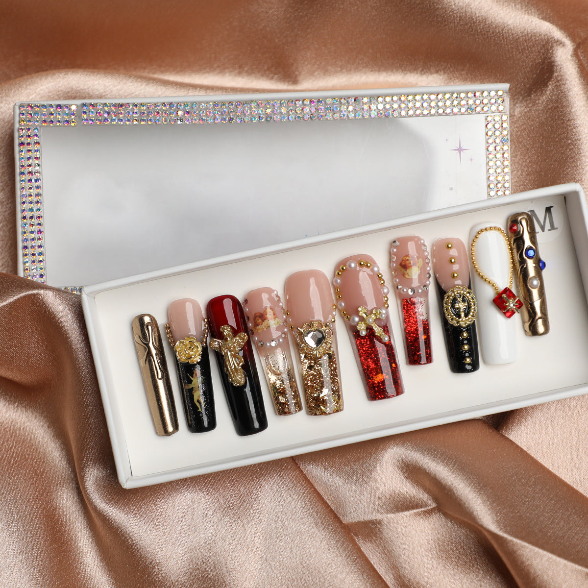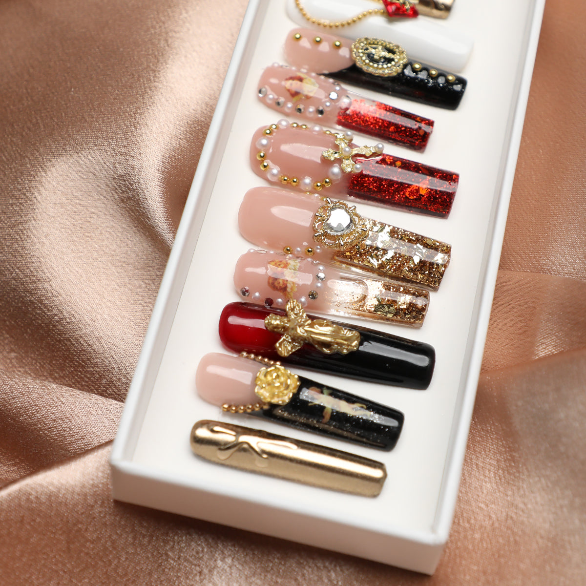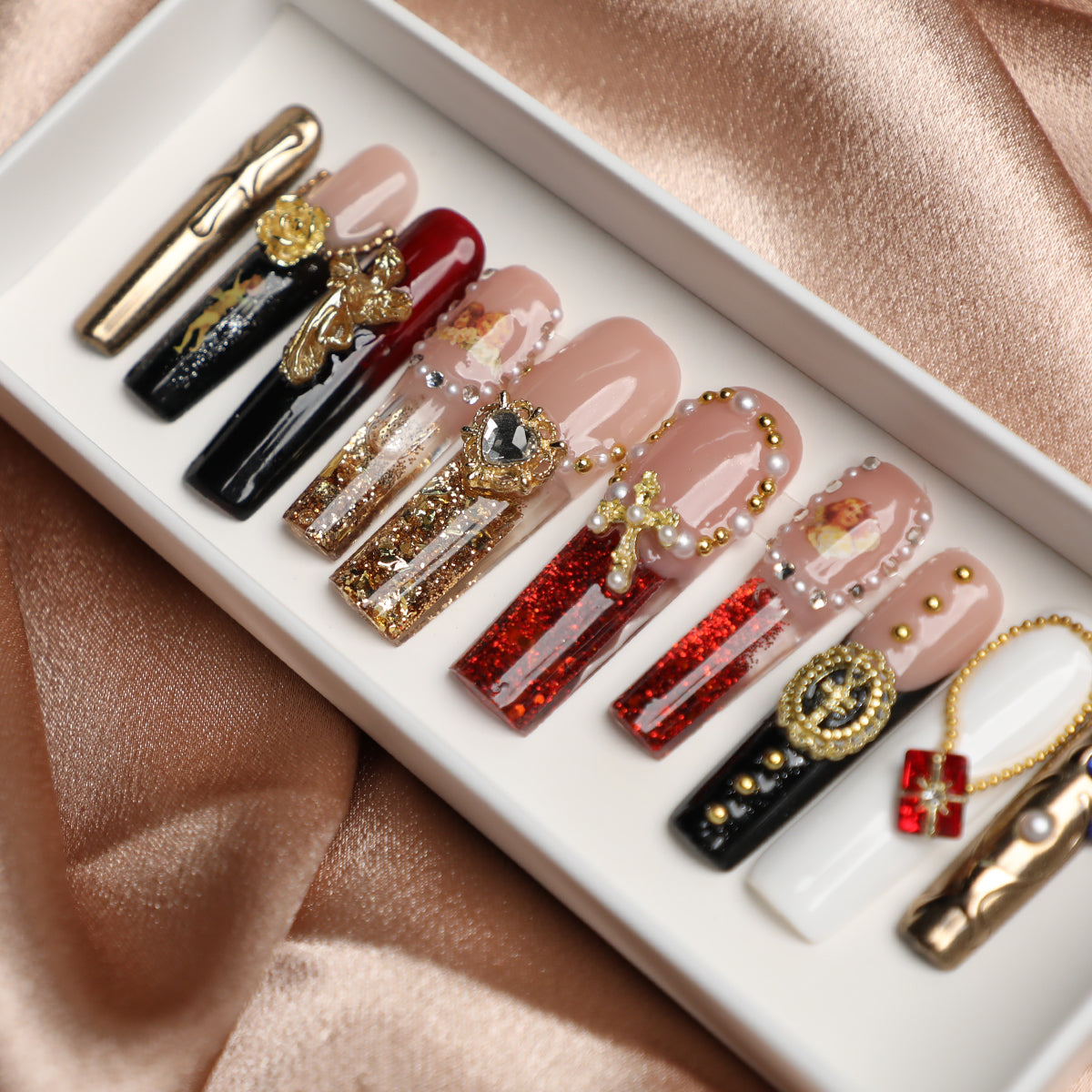 Step into a world of timeless elegance and celestial charm with these Divine Embrace Handmade Press-On Nails. Featuring a luxurious black, red, and gold palette, each nail is adorned with angel charms, golden roses, and delicate white hearts, evoking a vintage, religious-inspired aesthetic. Handcrafted with care, this full-cover acrylic set is reusable, blending sophistication with meaningful, symbolic details.