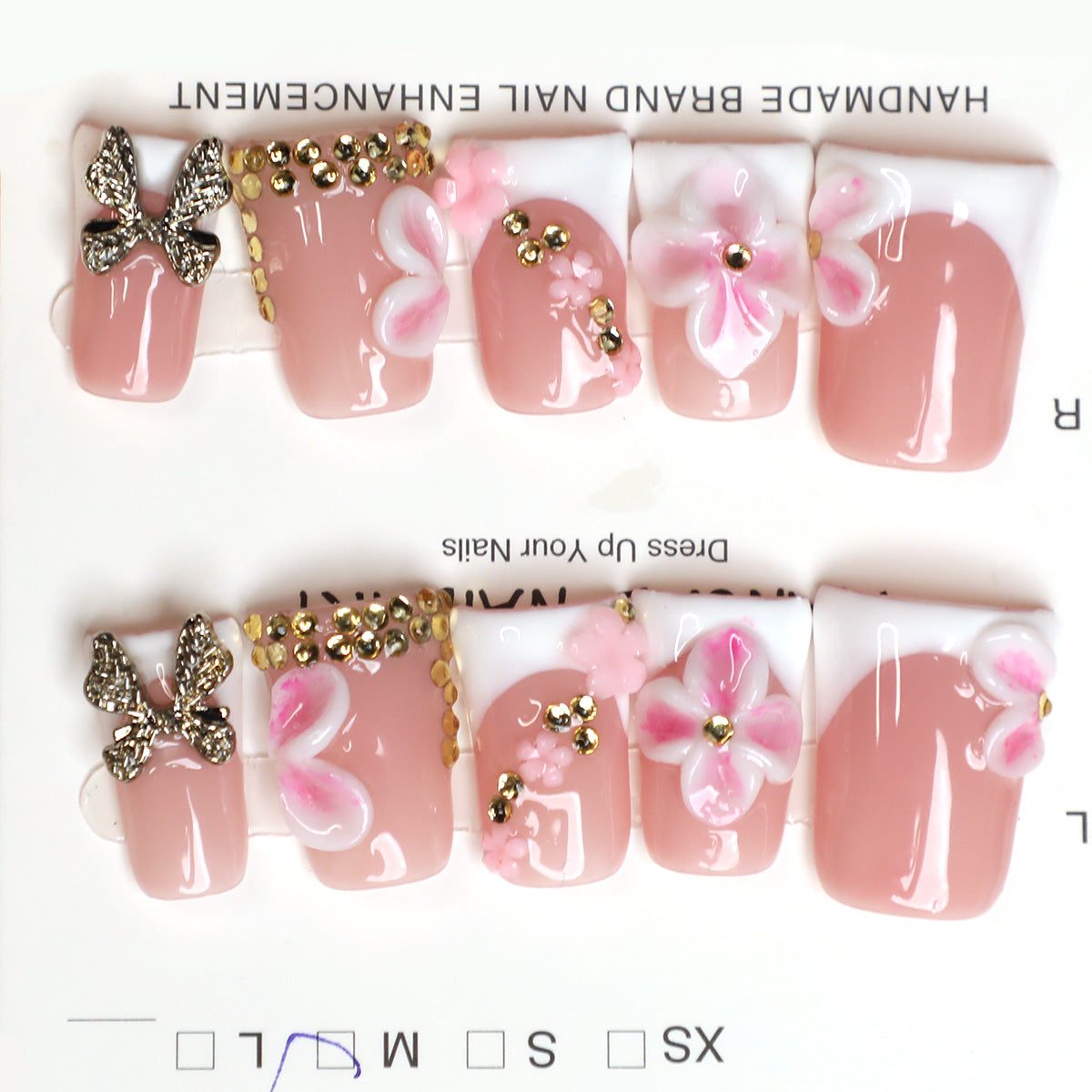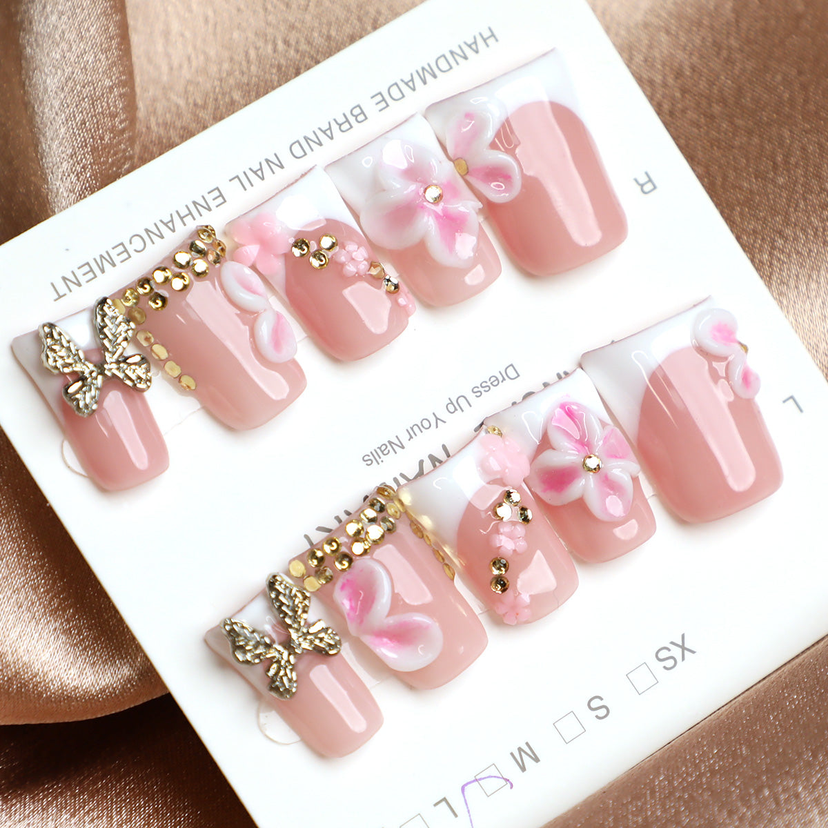 Step into a whimsical garden of elegance with these Enchanted Garden Handmade Press-On Nails. Featuring a soft pink base, each nail is adorned with delicate 3D flowers, sparkling rhinestones, and a charming gold butterfly, creating a dreamy and feminine look. Handcrafted with care, these full-cover acrylic nails are reusable, offering a salon-quality finish that’s both playful and sophisticated.