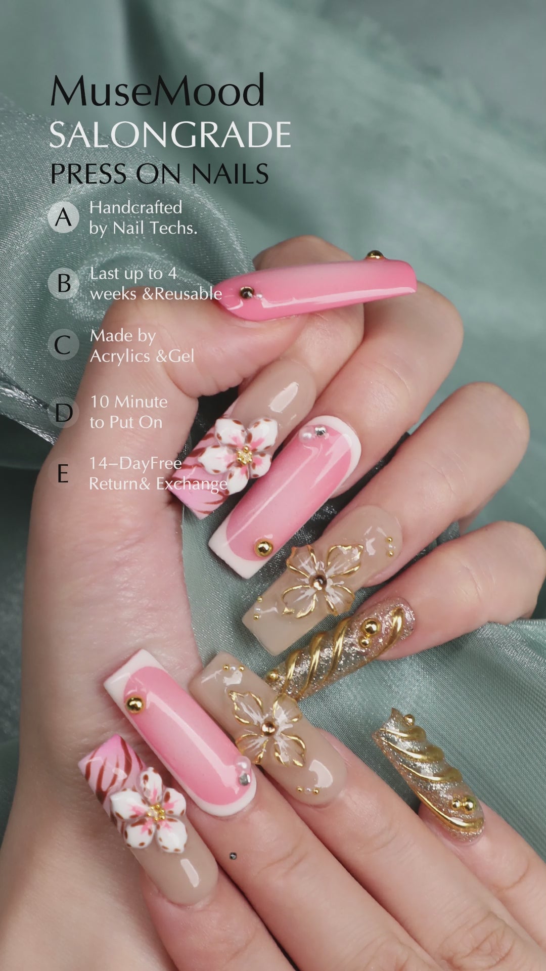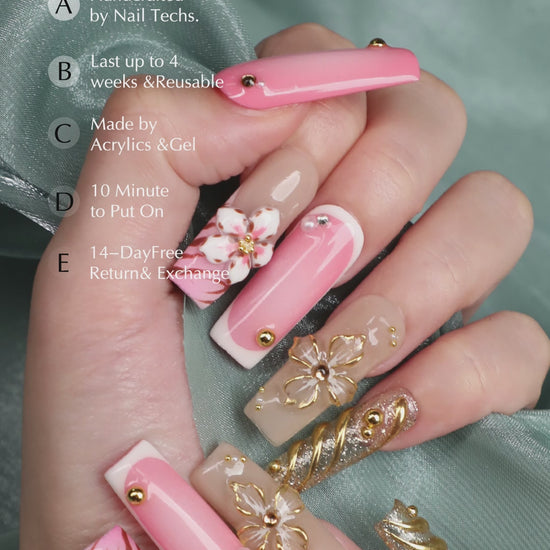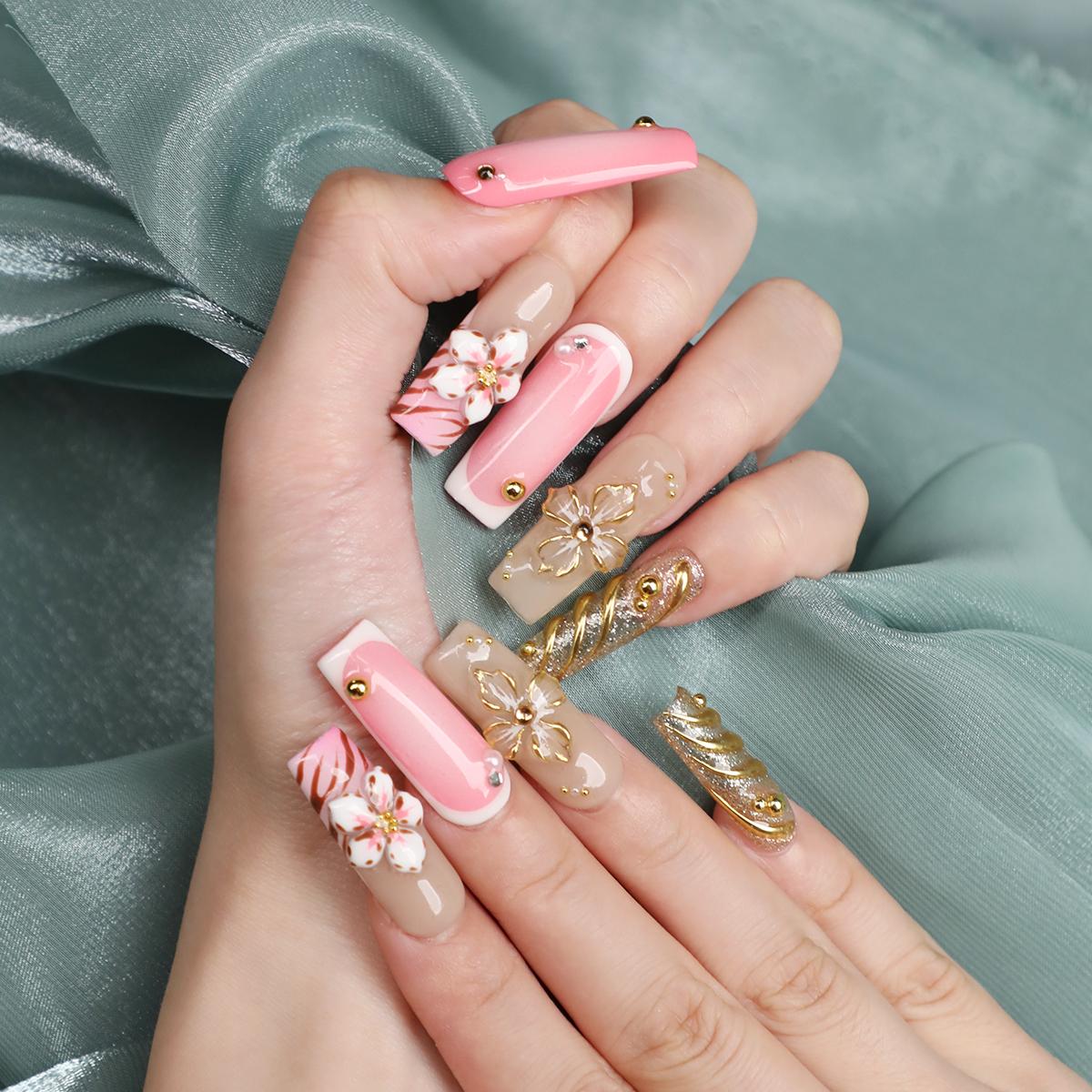 This medium-length, handmade square shape nail set is ideal for beginners. It's perfect for daily wear, parties, and dinners. The cherry blossom season theme adds a touch of elegance. đ¸