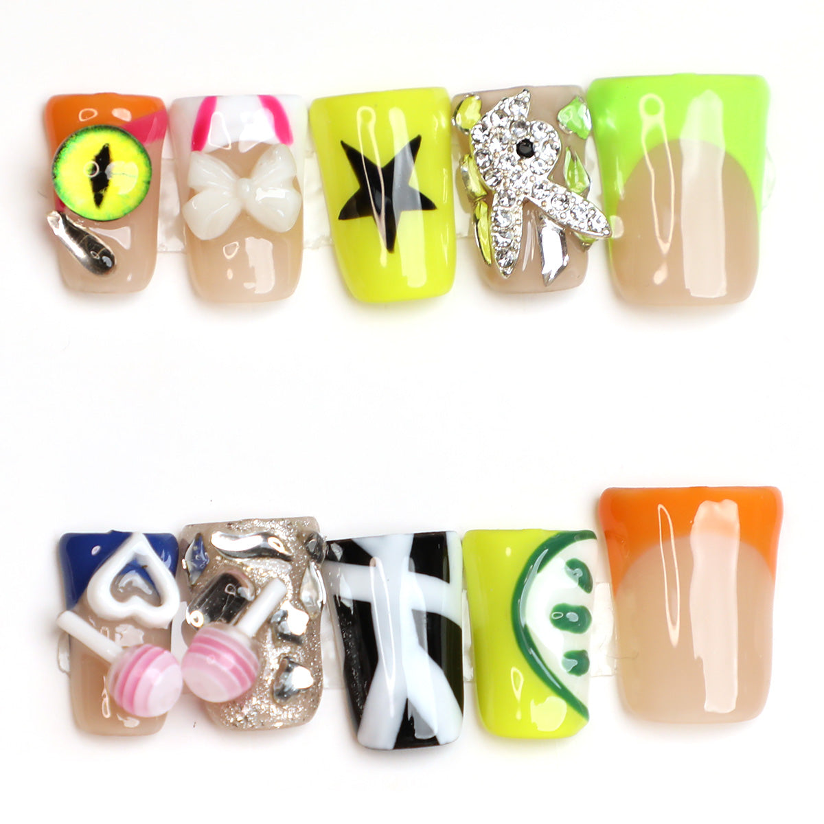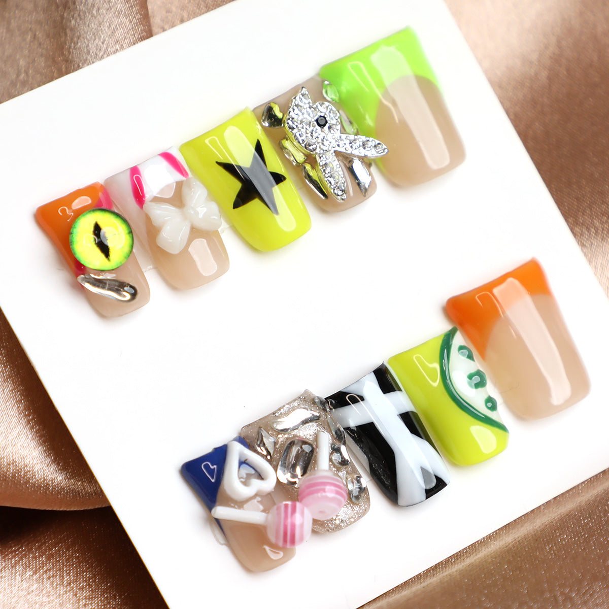 Cyber Y2K Neon Handmade Press-on Nails Set with Evil Eye & Heart Accents