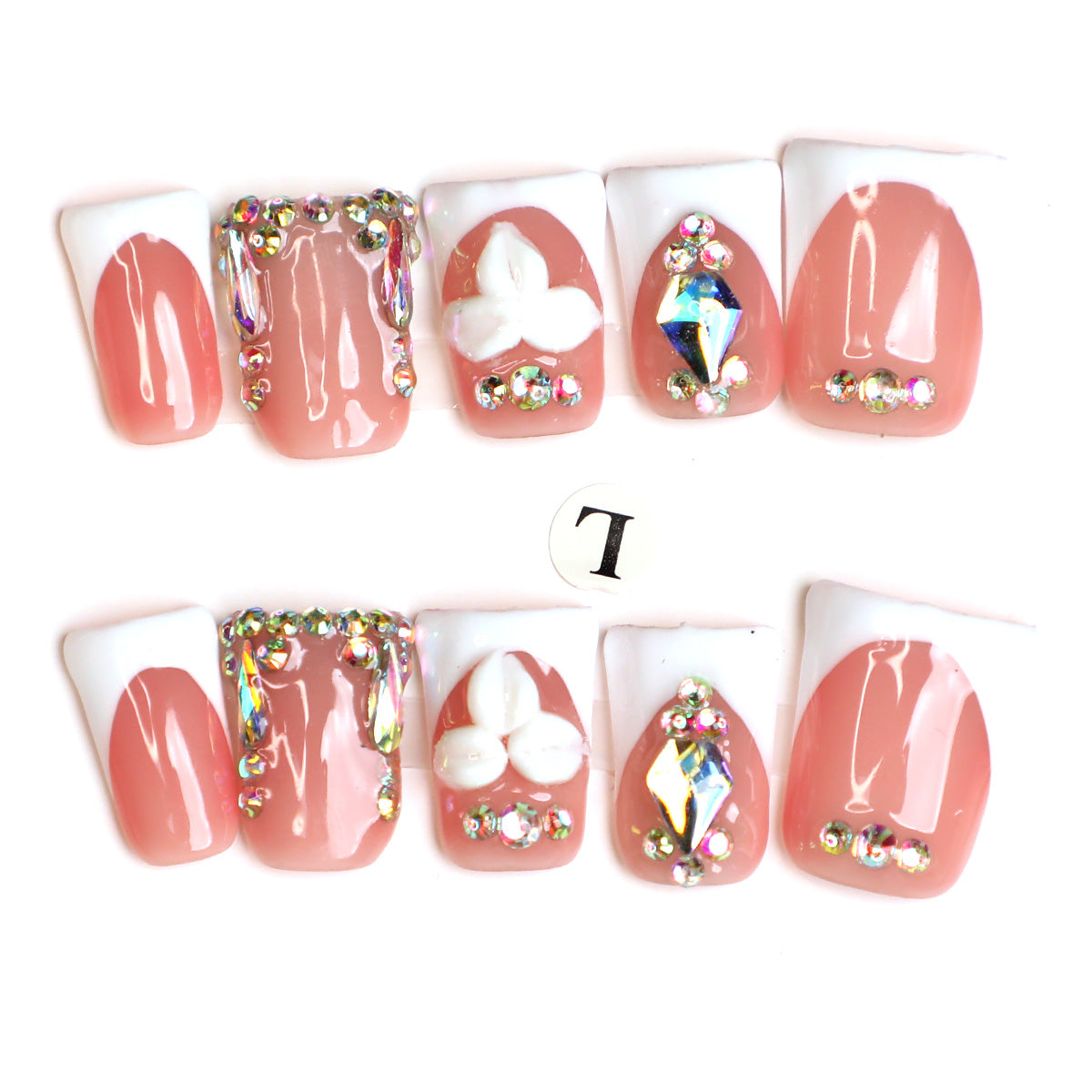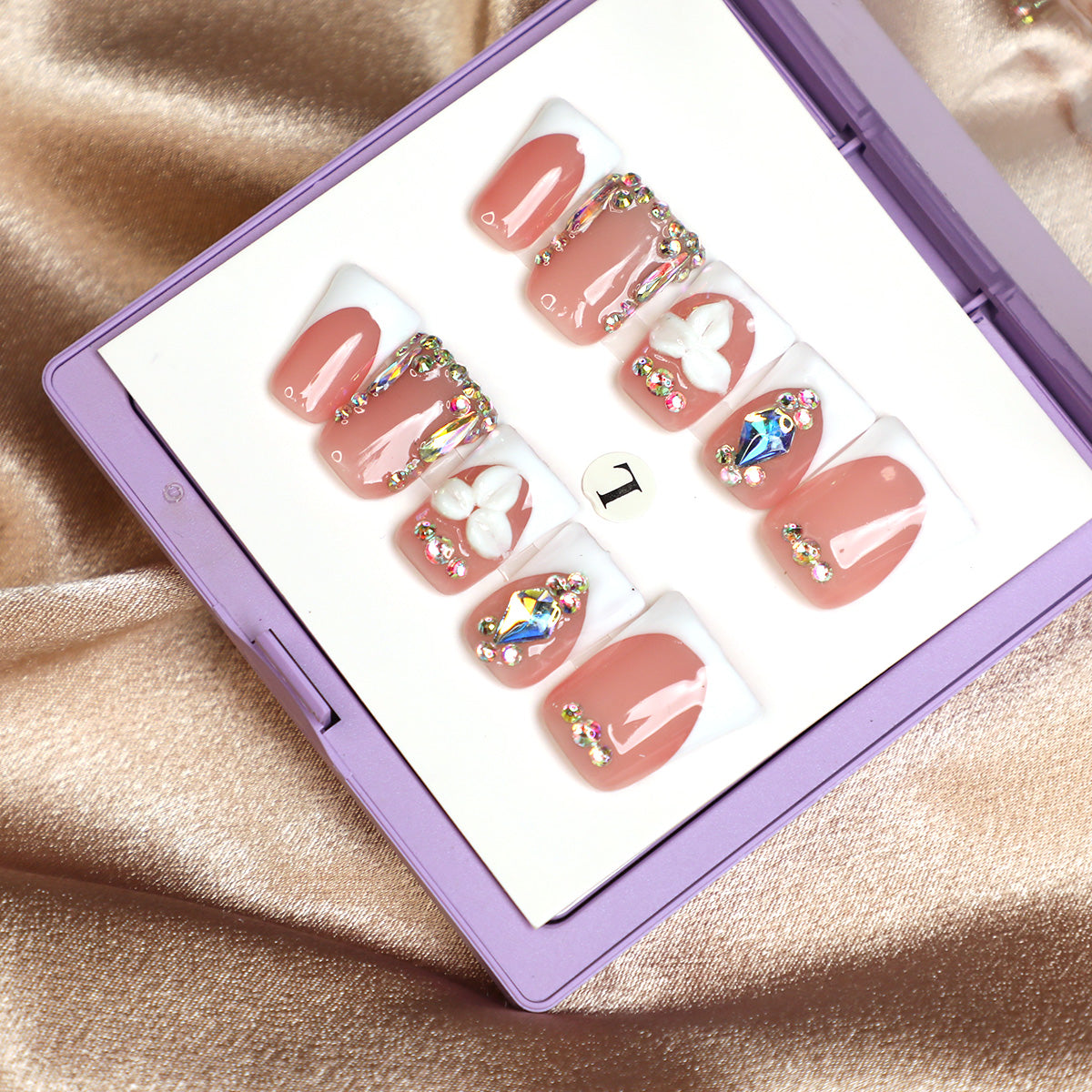 Add a touch of timeless elegance with these Elegant Sparkle Handmade Press-On Nails. Featuring a classic pink and white French tip design, each nail is adorned with sparkling rhinestones, creating a refined and feminine look. Handcrafted with care, these full-cover acrylic nails are reusable, offering a salon-quality finish perfect for any occasion.