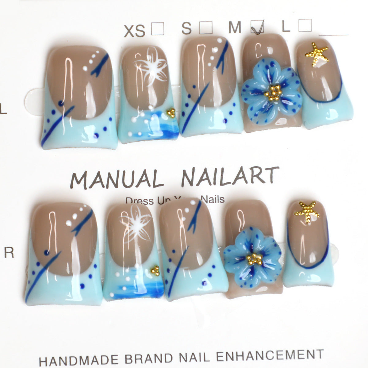 Luxury Blue Floral Handmade French Press-On Nails – Reusable Full-Cover Acrylic with Delicate Flowers, Glitter & 3D Accents, Perfect for Weddings, Parties & Everyday Elegance (10 PCS)