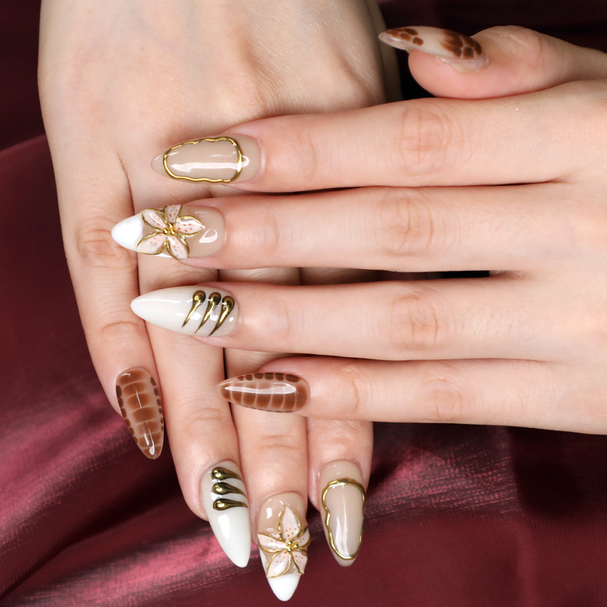 - The set includes short brown almond-shaped nails. đ