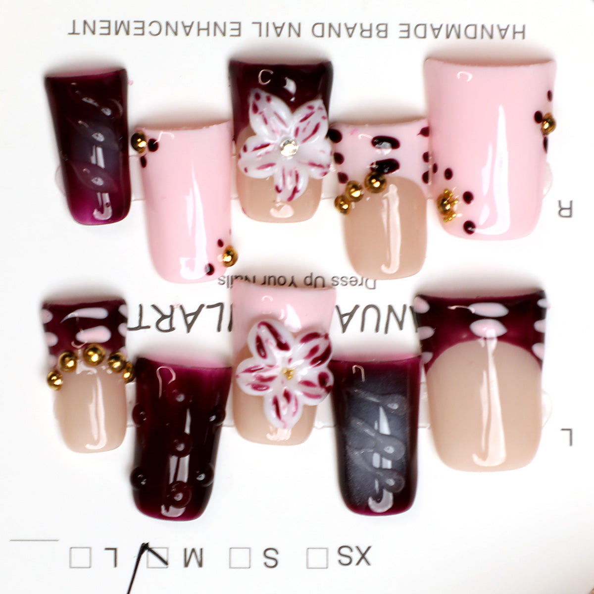 Romantic Luxury Handmade French Press-On Nails with Floral Art Burgundy & Pink Tone Reusable Full-Cover Acrylic Nail Set