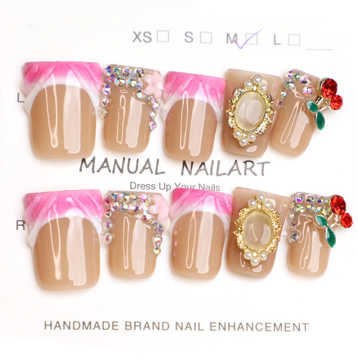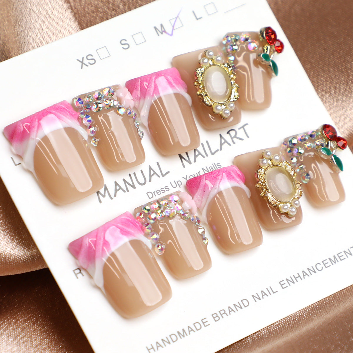 Add a touch of cute and playful elegance to your manicure with these Sweet Blossom Handmade Press-On Nails. Featuring a soft pink and nude French tip design, each nail is adorned with adorable cherry charms, creating a sweet and feminine look. Handcrafted with care, these full-cover acrylic nails are reusable, giving you a charming, salon-quality finish anytime.