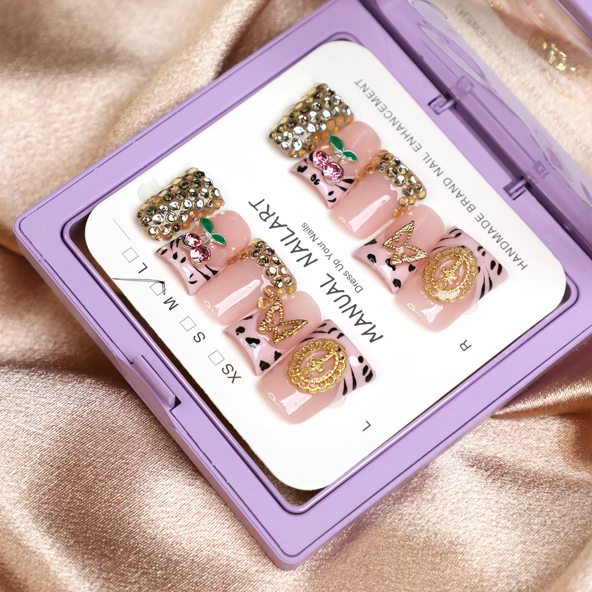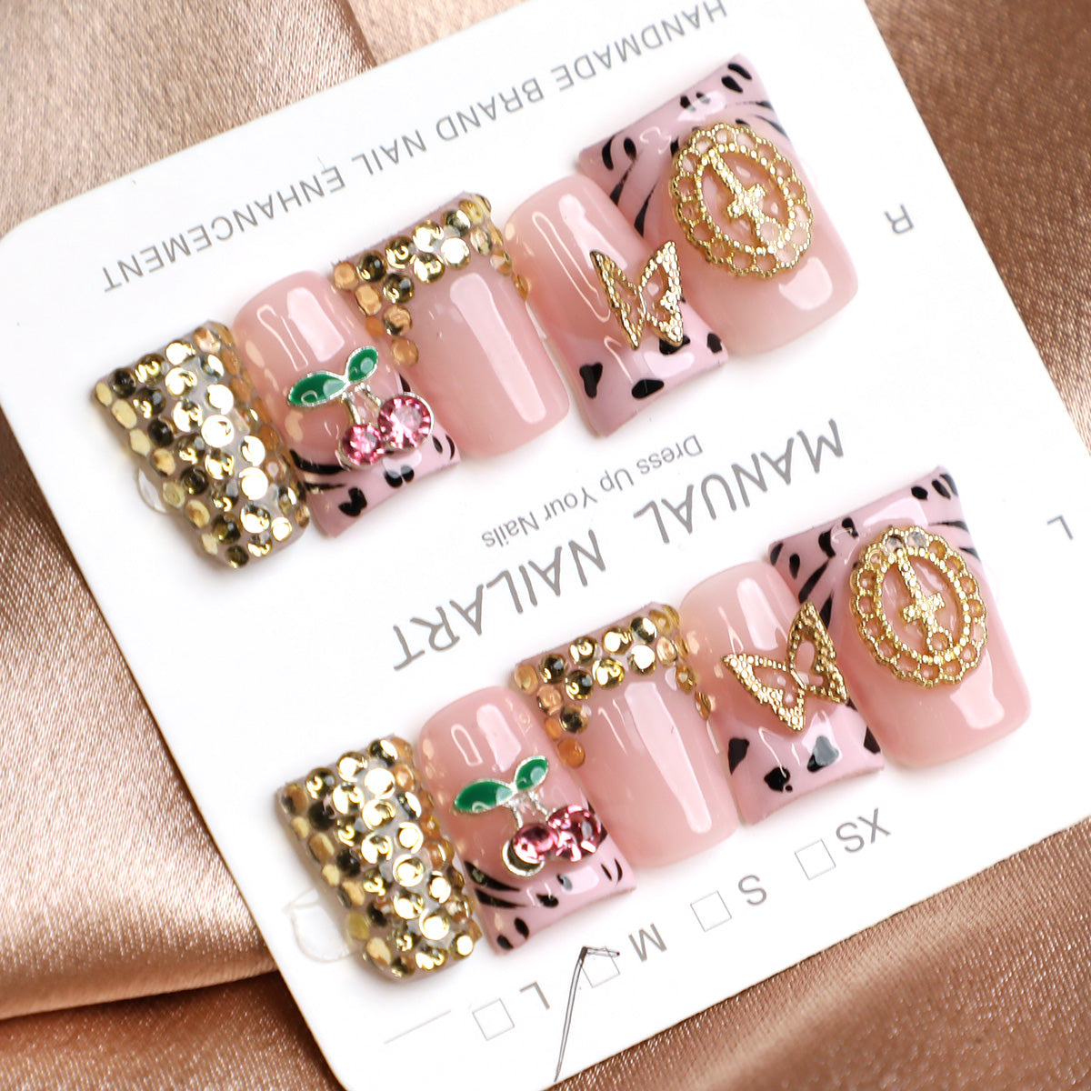 Add a touch of playful elegance with these Sweet Cherry Handmade Press-On Nails. Featuring a soft nude and crystal pink French tip design, each nail is adorned with sparkling brown rhinestones and a cute cherry charm, creating a charming, feminine look. Handcrafted with care, these full-cover acrylic nails are reusable, giving you a salon-quality finish that’s sweet, stylish, and fun.