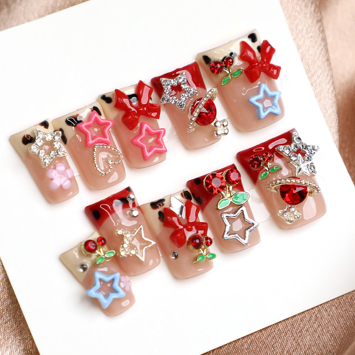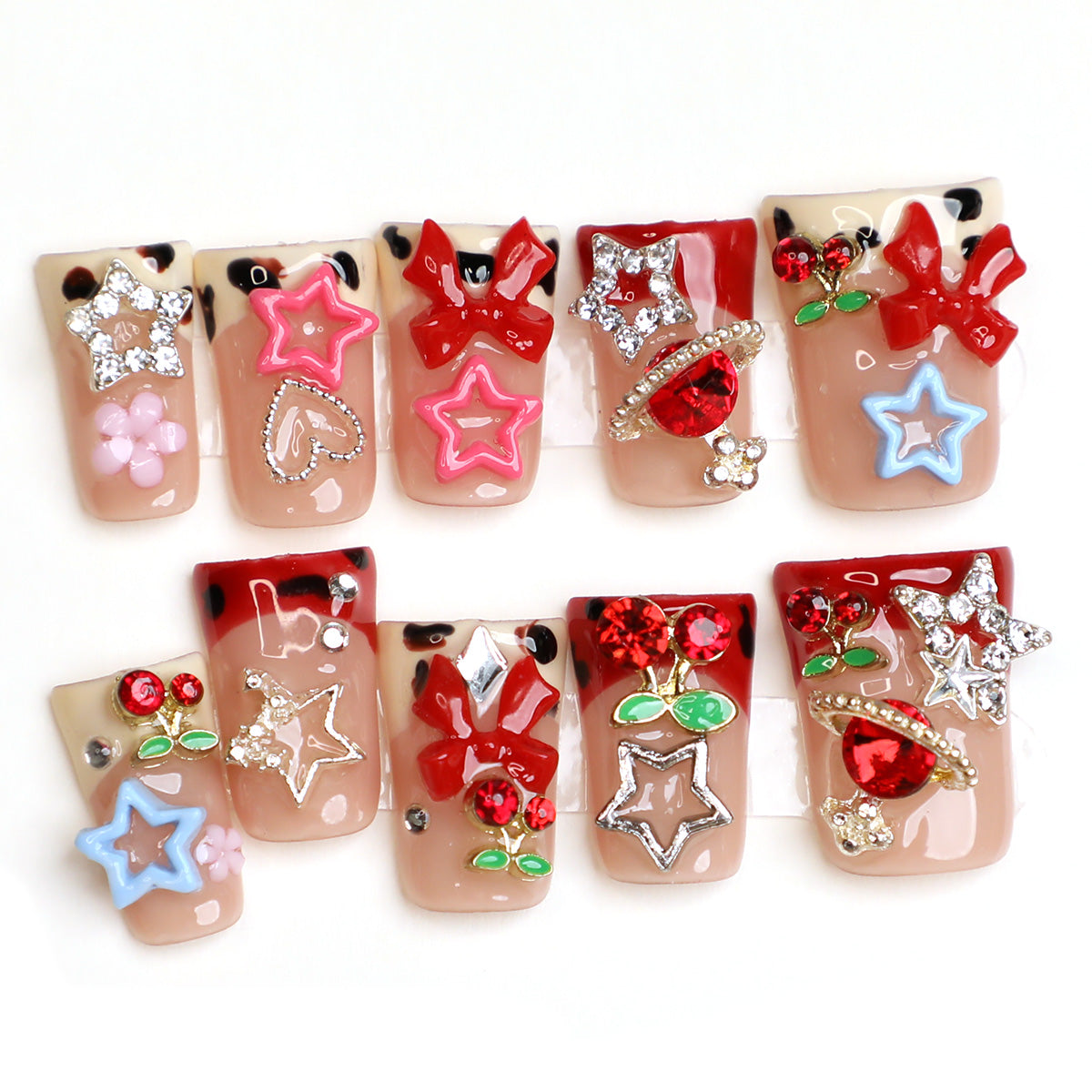Add a playful and charming touch to your manicure with these Sweet Scarlet Handmade Press-On Nails. Featuring a vibrant red French tip base, each nail is adorned with adorable red bows, cherries, stars, and heart charms, creating a fun and feminine look. Handcrafted with care, these full-cover acrylic nails are reusable, giving you a salon-quality, whimsical finish anytime.